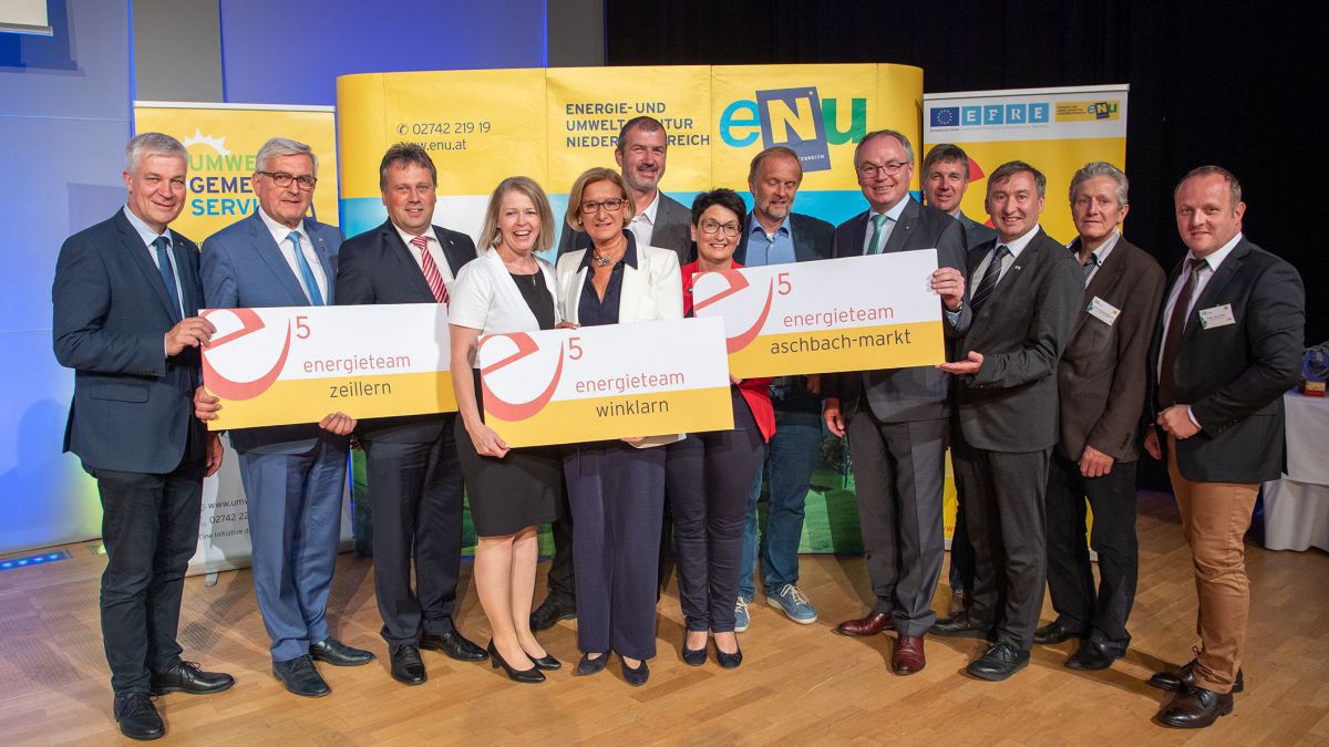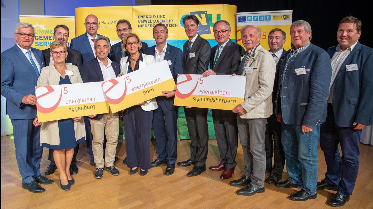 Engagierte Gemeinden setzen direkt mit der Bevölkerung Maßnahmen um. Sie sind wichtige Partner zur Erreichung der NÖ Klima- und Energiefahrplan-Ziele. Die Fortschritte der Städte Baden und Wieselburg zeigen ein beispielhaftes Bild für die zukünftige landesweite Entwicklung. Sie sind mit Großschönau die ersten drei Gemeinden Niederösterreichs mit fünf „e“. Auch die Leistungen weiterer e5-Gemeinden punkten bei der Auszeichnung: Mit vier „e“ stechen Klosterneuburg, Mödling, Sierndorf und Wiener Neudorf heraus. Drei „e“ erhielten Grafenwörth, Kapelln, Kirchberg an der Pielach, Leopoldsdorf (bei Wien) und Vösendorf, zwei „e“ gingen an Hofstetten-Grünau und ein „e“ an Wilhelmsburg.