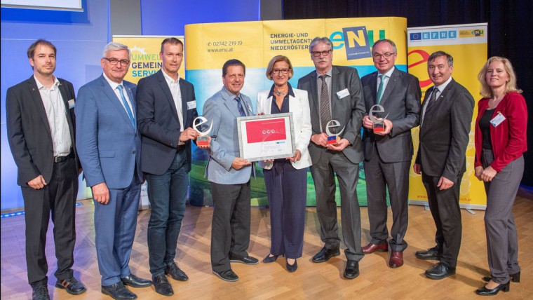 GR Ernst Schebesta , GR Herbert Dopplinger, GRin Angela Stöckl-Wolkerstorfer, StR Johann Hornyik, Vizebürgermeisterin Helga Krismer-Huber, Präsident Alfred Riedl, StRin Erna Koprax, Otto Wolkerstorfer, StRin Carmen Jeitler-Cincelli, Landeshauptfrau Johanna Mikl-Leitner, Bürgermeister Stefan Szirucsek, LH-Stellvertreter Stephan Pernkopf, Roland Enzersdorfer, Susanne Kopecky, Gerfried Koch, Herwig Troyer, eNu-Geschäftsführer Herbert Greisberger, GR Christian Ecker, Michaela Huemer und GR Michael Capek freuen sich über die e5-Auszeichnung.