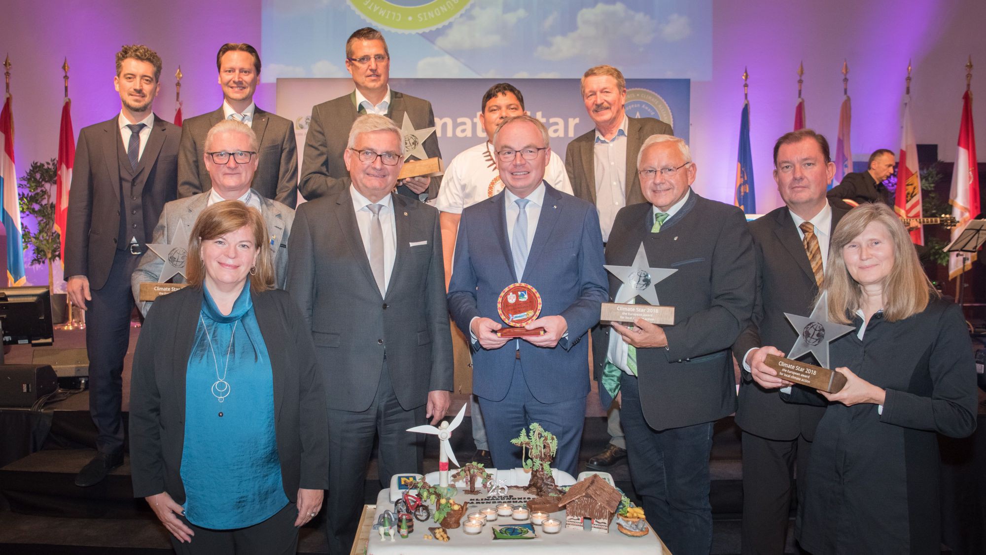v.l.n.r. : LH-Stellvertreter Stephan Pernkopf, Gemeindebund-Präsident Alfred Riedl, Petra Schön, Markus Hafner-Auinger und Rainer Handlfinger vom Klimabündnis mit den niederösterreichischen Climate-Star-Preisträgern aus Krummnußbaum, Ternitz, Böheimkirchen und Wiener Neudorf